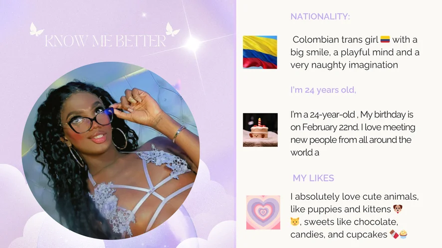 NATIONALITY: Colombian trans girl 🇨🇴 with a big smile, a playful mind and a very naughty imagination I’m 24 years old: My birthday is on February 22nd. I love meeting new people from all around the world a MY LIKES I absolutely love cute animals, like puppies and kittens 🐶🐱, sweets like chocolate, candies, and cupcakes 🍫🧁